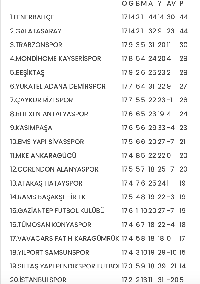Süper Lig’de 18. hafta maçlarının akabinde oluşan puan durumu şöyle: