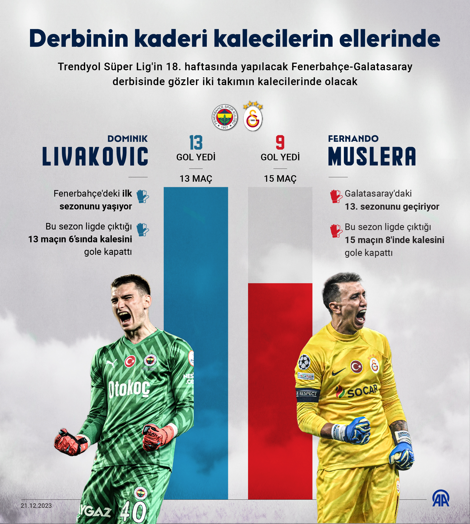 Fenerbahçe’deki ilk sezonunu yaşayan Hırvat kaleci Dominik Livakovic ile Galatasaray’daki 13. sezonunu geçiren 37 yaşındaki Uruguaylı file bekçisi Fernando Muslera‘nın ortaya koyacağı performans, takımlarının alacağı iyi veya kötü sonuçta belirleyici olacak.